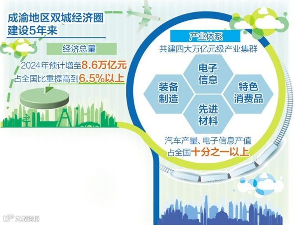 国家发展改革委副秘书长陈亚军用“四个新”概括双城经济圈建设成效:一是具有全国影响力的重要经济中心建设实现新跃升;二是具有全国影响力的科技创新中心建设呈现新气象;三是改革开放新高地建设获得新突破;四是高品质生活宜居地建设取得新进展。经济总量上,双城经济圈地区生产总值5年迈上了两个万亿元级台阶,2024年预计增至8.6万亿元。