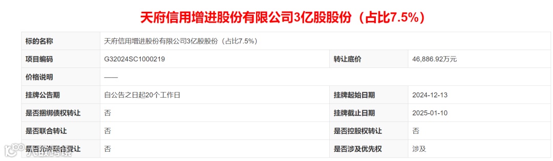 四川西南联交所信息官网显示,天府信用增进股份有限公司3亿股股份(占比7.5%)挂牌转让,转让底价46886.92万元,转让方为中银投资资产管理有限公司,披露结束日期为2025年1月10日。