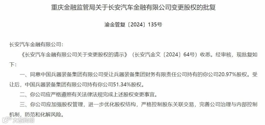 2024年11月18日,国家金融监督管理总局重庆监管局发布公告称,同意中国兵器装备集团有限公司受让兵器装备集团财务有限责任公司(简称“兵装财务公司”)持有的长安汽车金融有限公司(简称“长安汽金”)20.97%股权。受让后,中国兵器装备集团有限公司(简称“中国兵装”)持有长安汽车金融有限公司51.34%股权。