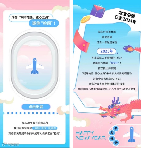 2023年10月-2024年2月,财富成都新媒体联合成都市民政局等单位,整合“SVG+原创手绘+大数据”等数“智”化新媒体产品,面向成都数百万家庭,开展“明眸皓齿、正心立身”未成年人关爱专项行动系列传播活动,用趣味情景剧“解锁”未成年人视力防护、牙齿保护、身心健康等未成年人关爱专项行动,引导更多未成年人家庭,主动参与成都市民政局牵头开展的未成年人保护民生服务专项行动,放大政府惠民服务时效。