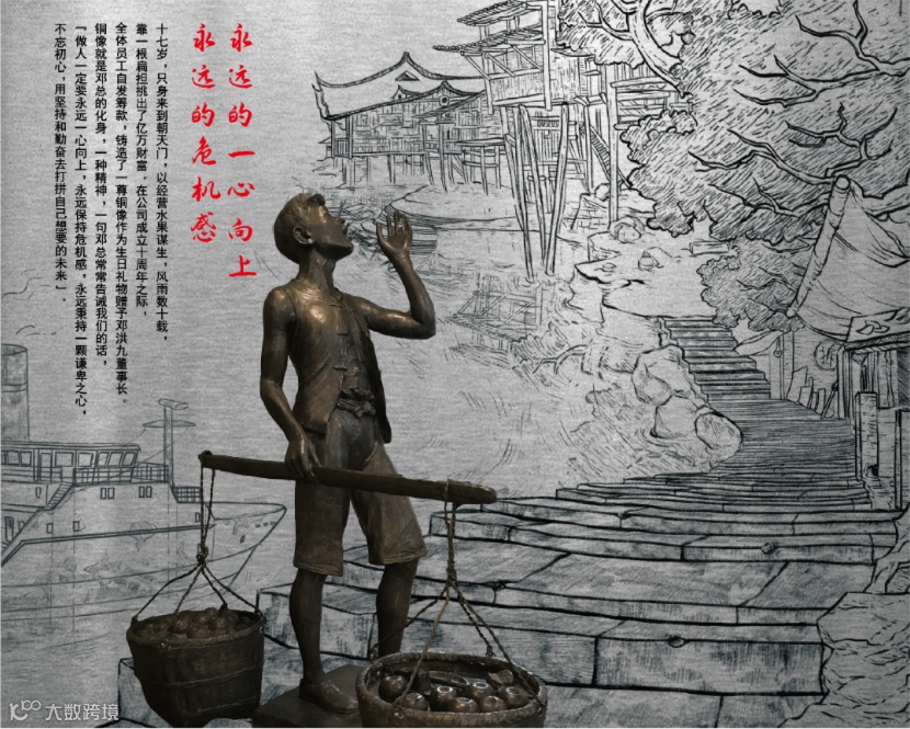 1987年,年仅17岁的邓洪九独自一人到了重庆朝天门,加入棒棒大军,干起了挑担卖水果的生意。年轻、善于观察、脑子转得快,让邓洪九在短时间内发现了红桔的商机。那时,朝天门周围的红桔零售价格高,中间利润低,而邓洪九的家乡重庆长寿县的价格却远低于朝天门。邓洪九想,若是将家乡的红桔运到朝天门来售卖,将能赚取大额差价。邓洪九越想越激动,立马回家乡收购了红桔,仅第一个月,就赚取了80元,达到了城里普通工人的月薪。