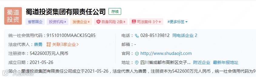 据了解,蜀道投资集团有限责任公司法定代表人为唐勇,企业地址位于四川省成都市高新区交子大道499号中海国际中心H座,所属行业为商务