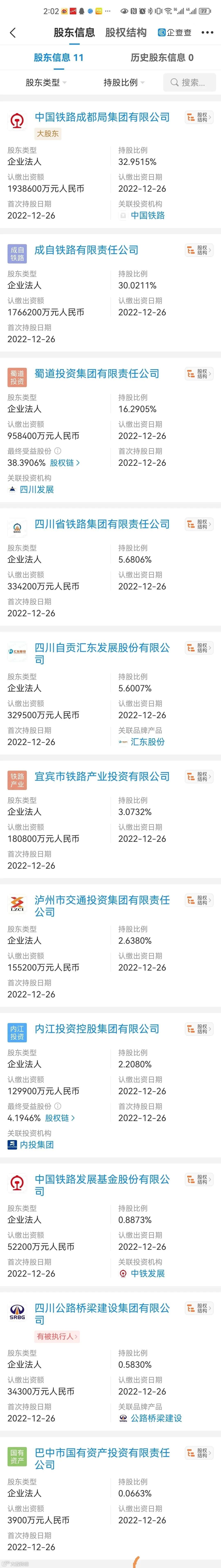 了解,四川铁路发展有限公司共有11位股东,前三大股东分别为持股32.9515%的中国铁路成都局集团有限公司,持股30.0211%的成自铁路有限责任公司,持股16.2905%的蜀道投资集团有限责任公司。
