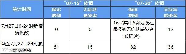 “07·15”疫情无新增本土确诊病例,无新增本土无症状感染者。截至27日24时,本起疫情累计报告本土确诊病例61例,本土无症状感染者15例。