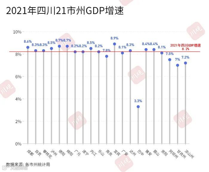 其中,经济总量排名较前的市(州)依然保持较高增速。首次跃上3000亿元台阶的宜宾以8.9%的增速领跑,紧随其后的是8.7%增速的德阳和绵阳,以及8.6%增速的成都。