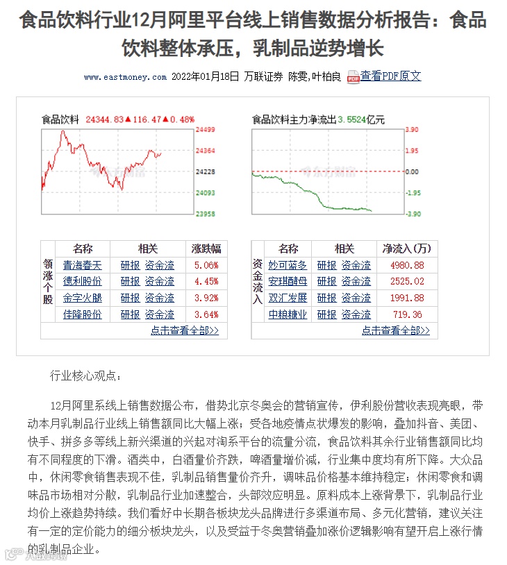 万联证券研报显示,借势北京冬奥会的营销宣传,2021年12月,当月,伊利阿里渠道实现销售额10.08 亿元,位列行业第一。
