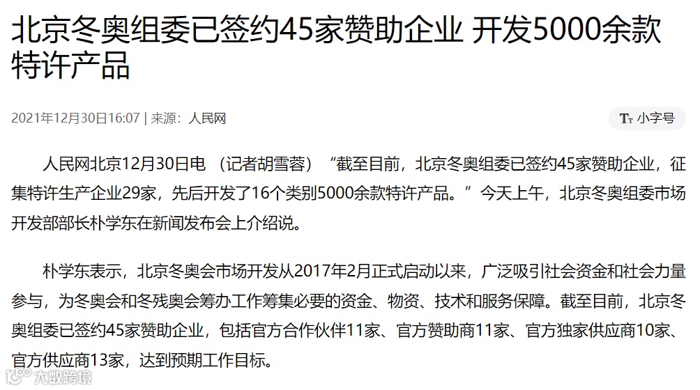 北京冬奥组委近日发布《北京2022年冬奥会和冬残奥会经济遗产报告(2022)》显示,除了14家奥林匹克全球合作伙伴外,北京冬奥会已签约45家赞助企业,其中官方合作伙伴11家,官方赞助商11家,官方独家供应商10家,官方供应商13家。