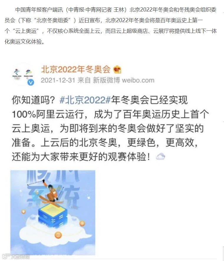 还有,今年北京冬奥已经完成核心系统迁移上云。这是奥运史上首次由云计算替代传统IT,至此,奥运最核心的赛事成绩、赛事转播、信息发布、运动员抵离、医疗、食宿、交通等信息系统迁移至云上。
