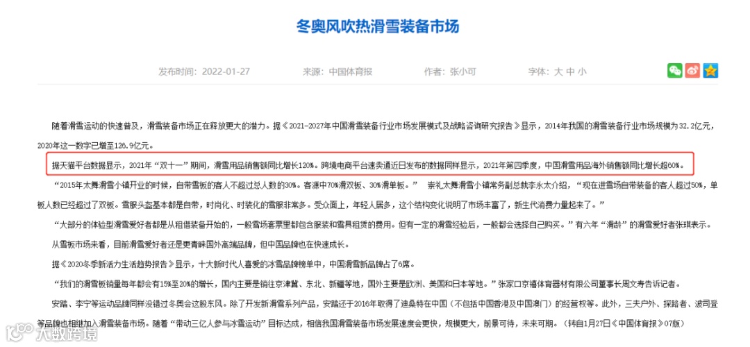 天猫2021年“双11”数据显示,滑雪用品销售额同比增长120%;自2022年1月1日以来,唯品会上的滑雪装备订单量同比增长约70%;2022年京东年货节期间,冰雪运动相关品类成交额同比增长了135%。