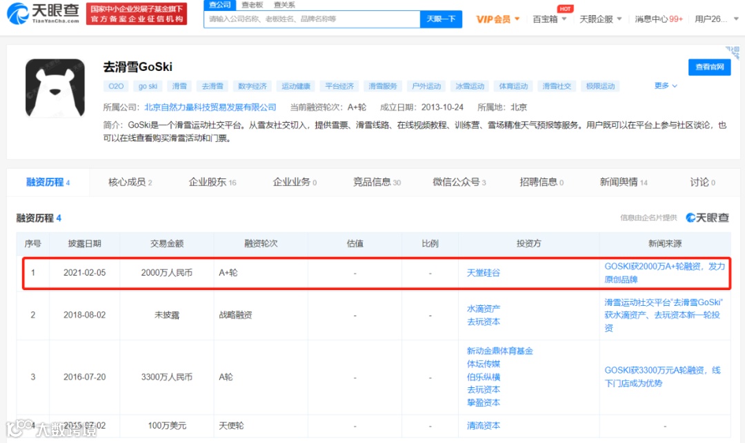 2021年,与冰雪相关的领域就已实现多笔融资。2021年2月,滑雪社交平台GOSKI获得了2000万元A+轮融资;随后,雪鸮科技、单板滑雪品牌奥雪文化和滑雪培训机构SNOW51在2021年均获得了两轮融资。今年1月,雪鸮科技再次完成新一轮融资。