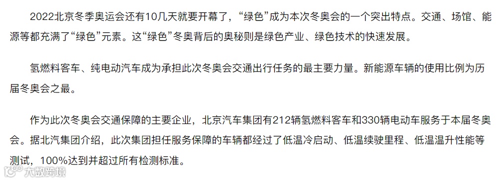 其次,这届冬奥会也成了新能源汽车比拼的舞台。据北京冬奥组委官方统计,冬奥会赛事交通服务用车中,节能与清洁能源车辆在小客车中占比100%,在全部车辆中占比85.84%,为历届冬奥会最高。冬奥会期间还将示范运行超1000辆氢能源汽车(即氢燃料电池汽车),配备30多个加氢站。据不完全统计,截至2021年12月,氢能源燃料电池相关投资项目约85项,投资总金额约1857.13亿元。