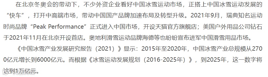 但不管抱着什么样的目的,冬奥会的热度之下,滑雪运动风靡,全民滑雪兴起,也直接刺激了滑雪用品消费需求的高涨。