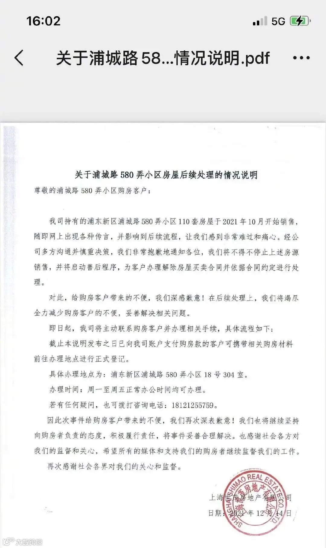 至于为何最终选择全部退房,世茂称,公司所持有的浦东新区浦城路580弄小区110套房屋,于2021年10月开始销售,随即网上出现各种传言,并影响到后续流程,让世茂感到非常难过和痛心。经世茂多方沟通并慎重决策,非常抱歉地通知浦城路580弄小区购房客户,不得不停止上述房源销售,并将启动善后程序,为客户办理解除房屋买卖合同并依据合同约定进行处理,对给购房客户带来的不便深感歉意。