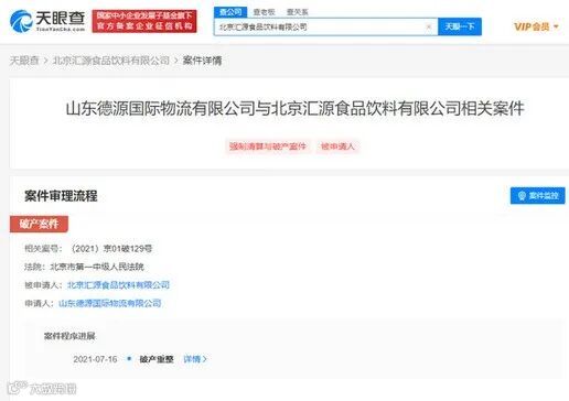天眼查App数据显示,北京汇源食品饮料有限公司新增破产重整信息,案号为(2021)京01破129号,申请人为山东德源国际物流有限公司,经办法院为北京市第一中级人民法院。
