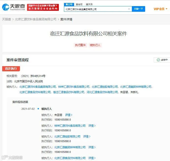 我还注意到,7月2日,汇源新增一条被执行人信息,案号(2021)京04执314号,执行标的超15.9亿元,执行法院为北京市第四中级人民法院。
