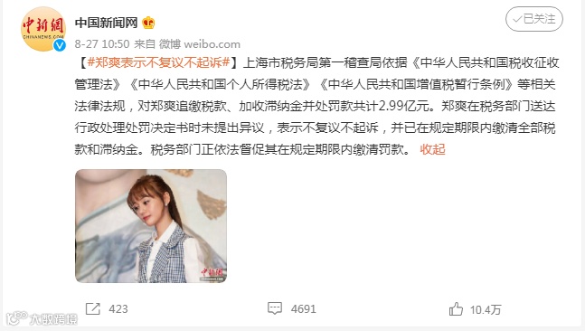 众所周知,早在2018年,范冰冰事件就引发了影视圈的“税收地震”。截至18年年底,影视行业自查申报税款高达117.47亿元。今年发生的郑爽事件中,有关部门追缴税款、加收滞纳金并处罚款共计2.99亿元。