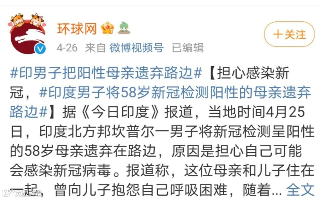 讲的是印度一男子的母亲新冠检测呈阳性,