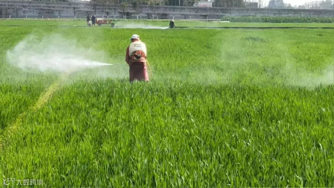 大邑一农村合作社工人正在田间撒药