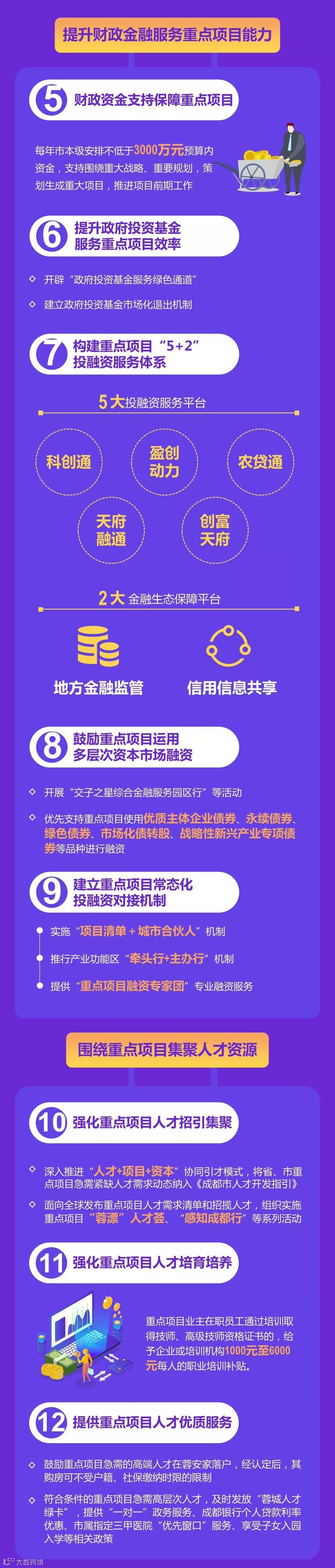 资金方面,“20条”主要从财政资金、政府性投资基金、“5+2”投融资服务体系、多层次资本市场、常态化投融资对接机制5个方面提出支持政策和措施。成都将实施“项目清单+城市合伙人”机制,按双月推介发布省、市重点项目融资需求清单,吸引金融机构和社会投资方以多种途径和方式参与投资建设。推行产业功能区“牵头行+主办行”机制,为产业功能区内省、市重点项目量身定制融资。