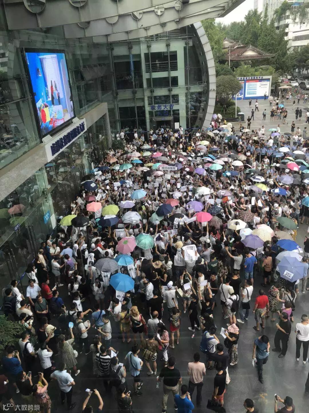 7月25日上午,超过50个楼盘的业主聚集在成都房管局大厦门前进行维权,抗议房屋的装修质量问题。