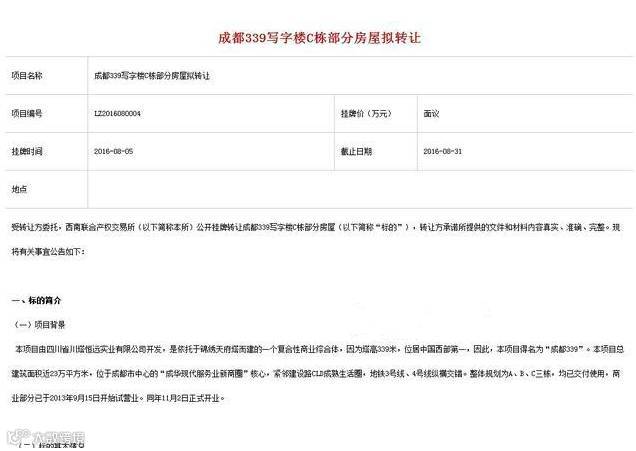 挂牌公告称,“成都339写字楼(毗邻成都电视塔)C栋部分房屋转让,面积2912.61平米,总底价为34951320元,出让单价为1.2万/平米。公告在8月31日截止。公告期内,如公开征集到一家符合受让条件的意向受让方,则采用协议转让方式交易标的。公告期内,如公开征集到两家或两家以上意向受让方,则采用网络竞价的方式。标的接受整体或单独受让,整体受让优先。标的目前尚未办理产权证。”