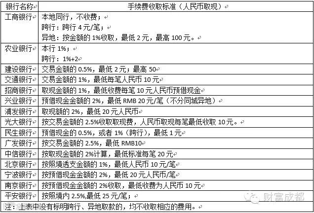 财富成都理财快报:利用信用卡的取现功能,可以让持卡人解决燃眉之急。但是,不同商业银行发行的信用卡,取现的时候所花费的手续费差别是很大的。界面新闻整理了目前国内主要商业银行的信用卡境内取现手续费信息,看哪家最划算?由于华夏银行和中国银行官网网站未公布其信用卡取现手续费,因此,没有包含在内。