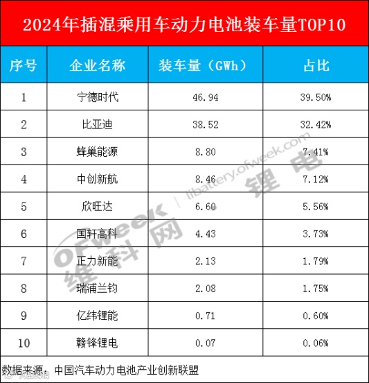 根据中国汽车动力电池产业创新联盟1月13日发布的数据,2024年全年,国内插电式混合动力乘用车装车量TOP 10企业分别为:宁德时代、比亚迪、蜂巢能源、中创新航、欣旺达、国轩高科、正力新能、瑞浦兰钧、亿纬锂能、赣锋锂电。