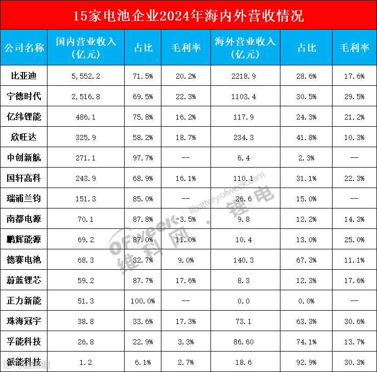 例如,宁德时代的国内营收和海外营收的占比分别为69.5%和30.5%,国轩高科的则分别为68.9%和31.1%,已基本是七三分的局面。
