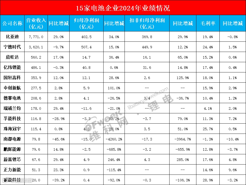 面对行业大考,在上月底,上市电池企业2024年业绩已基本全部揭晓。维科网锂电统计了15家企业的年报数据,其中11家实现盈利,但只有9家实现归母净利润正向增长。