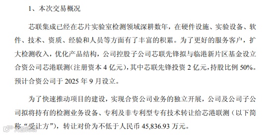 事实上,芯联先锋作为芯联集成的控股子公司,早在9月13日,芯联集成就发布公告,宣布拟将持有的检测业务设备、专利及非专利型专有技术转让给当时还在筹备中的芯港联测,转让对价不低于4.58亿元。