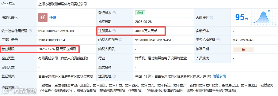 维科网电子9月29日消息,上海芯港联测半导体有限责任公司近日正式成立,其注册资本高达4亿人民币,任鹏任法定代表人,公司地址坐落在上海半导体产业“聚芯地”——中国(上海)自由贸易试验区临港新片区里。