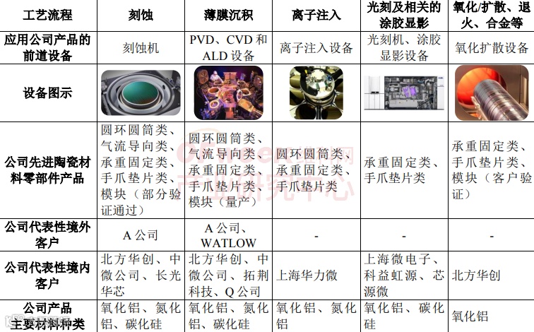 先锋精科全称为江苏先锋精密科技股份有限公司,成立于2008年,前身为“靖江先锋半导体科技有限公司”,2022年进行了股改并在2023年申请科创板IPO,目前仍处于审核状态。根据先锋精科披露的招股说明书显示,公司是半导体刻蚀设备和薄膜沉积设备零部件供应商,其为刻蚀设备和薄膜沉积设备提供的产品包括关键工艺部件、工艺部件和结构部件三大类,其中关键工艺部件产品包括腔体(反应腔、过渡腔、传输腔)、内衬、加热器、匀气盘等,工艺部件产品包括腔体盖板、接地环、喷嘴、气体分配环等,结构部件包括普通盖板、法兰板、信号箱、射频连接板等。