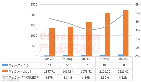 2019年以来,珂玛科技业绩稳步提升,2023年实现营收48044.96亿元,近5年年均复合增长率为28.6%,同时,公司研发投入强度也逐步提高,研发人员从2019年的26人增长至2023年的152人,研发投入规模从870万元提升至4653.27万元,研发投入强度也从2019年的不足5%提升至如今的9.69%。业内领先的技术水平使得珂玛科技产品具备较强的拓展能力,截至目前,珂玛科技产品已经成功打入包括北方华创、中微公司、上海华力微、芯源微、长光华芯等多个半导体头部厂商供应链体系。