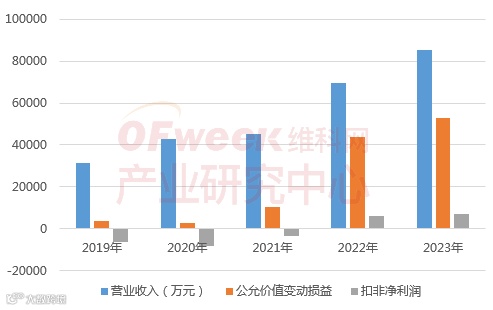 相对于快速增长的营收规模来看,中科仪主业的“赚钱”能力稍显不足,而投资能力则明显“更胜一筹”。2019年以来,公司归母净利润快速攀升,从-2443万元快速提高至6亿元,扣非净利润从亏损到逐步盈利,业绩大幅改善,2023年扣非净利润达到7045.8万元,同比增长14.3%,但公允价值变动损益对归母净利润贡献较大,主要是由于公司参股公司(拓荆科技)股票价格上涨带来的投资收益。