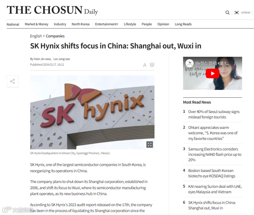 韩国最大的半导体巨头之一 SK 海力士准备重组中国业务,目前正在清算 2006 年成立的上海子公司,并计划将之重点转移到无锡,视无锡为其在中国的新业务中心。