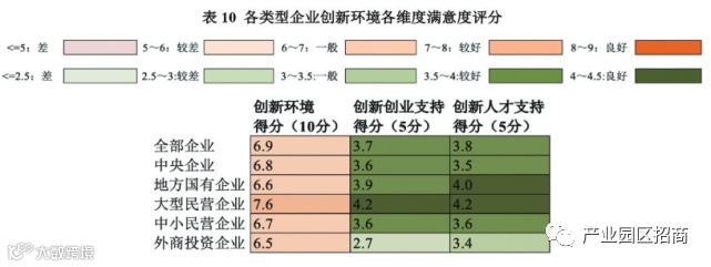 企业对于创新环境的总体评价一般,评分为6.9分,但是大型民营企业对于创新环境的评价较好,评分为7.6分(见表10)。具体而言,企业对于创新人才支持的评分(3.8分)高于对于创新创业支持的评分(3.7分)。最为显著的即为外商投资企业的评分。外商投资企业对于政府出台的对创新创业的相关支持评价较差,仅为2.7分,但是对于创新人才支持的评分为3.4分。其他企业情况类似,这反映出了国家在人才层面对企业的大力度支持。