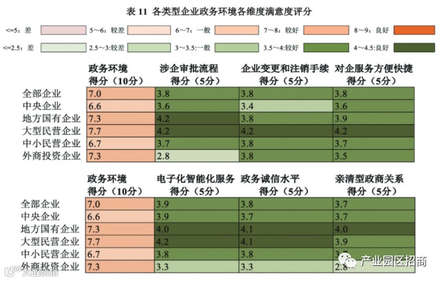 大型民营对于政务环境的总体满意度最高(7.7分),中小民营企业的总体评分较低(6.7分)。外商投资企业对于政务环境的总体评价较好(7.3分),但是对于各项具体维度的评分却较低,特别是对于涉企审批流程与政商关系的评价均较差,低于3分(见表11)。