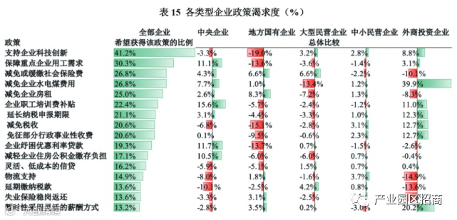 整体而言,支持企业科技创新是企业最希望得到的政策,其次是保障重点企业用工需求、减免或缓缴社会保险费、减免企业水电煤费用、减免企业房租、企业职工培训费补贴、延长纳税申报期限、减免税收、免征部分行政事业性收费等,主要集中在支持企业创新、支持企业复工复产与减免费用三大方面。具体而言,企业因类型的不同而呈现出对于政策支持的不同的需求(见表15):