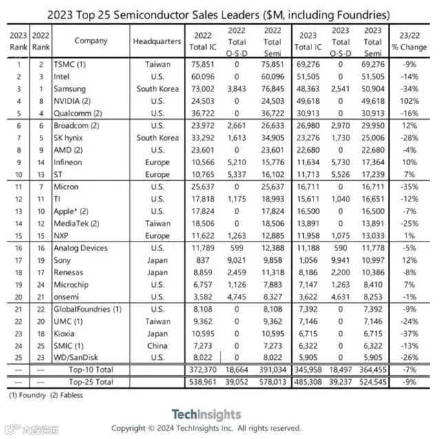 半导体市场权威研究机构TechInsights近期发布了备受瞩目的《2023全球Top 25半导体厂商》报告。该报告显示,台积电以692.76亿美元的营收傲视群雄,力压行业巨头英特尔,登顶全球半导体供应商之首,而英伟达则凭借营收同比劲增102%的惊人表现,成为榜单上增速最为迅猛的企业。中芯国际作为唯中国大陆唯一入榜全球Top 25半导体厂商的企业,排名由25升至24。