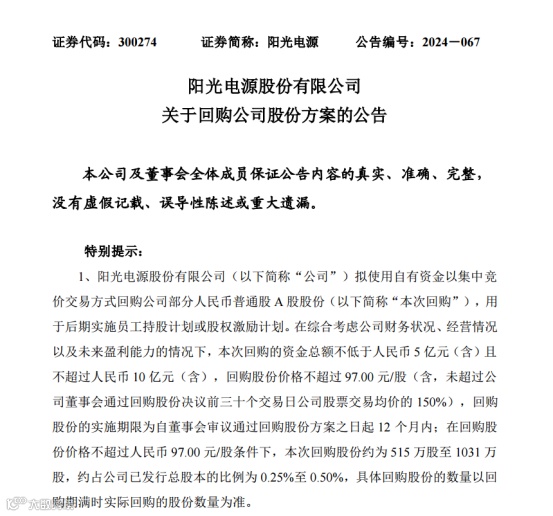 同日,阳光电源公告,拟在12个月内使用自有资金以集中竞价交易方式回购A股股份,回购股份价格不超过97元/股,回购总额不低于5亿元且不超过10亿元,本次回购股份约为 515 万股至 1031 万股,约占公司已发行总股本的比例为0.25%至 0.50%,用于后期实施员工持股计划或股权激励计划。