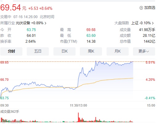 受此消息提振,市值超1400亿元的阳光电源午后开盘放量直线拉升,截至发稿大涨8.64%,报69.54元/股。