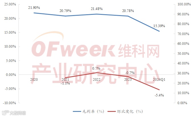 2020-2023年光伏上市企业毛利率整体稳定,2024年Q1下滑明显。在本轮光伏产业大发展中,样本上市企业的毛利率整体维持在21%左右。2024年以来,伴随着竞争加剧,光伏主链企业毛利率下滑明显,拉动样本整体毛利率大幅下滑。