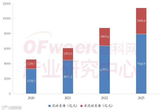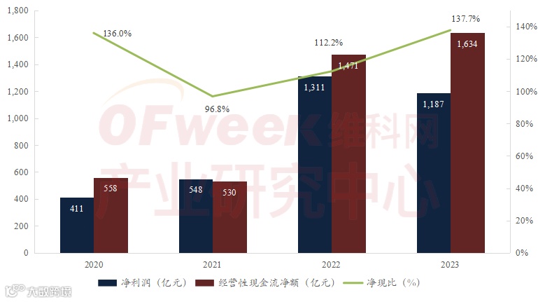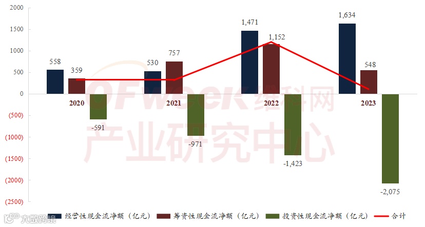总现金流为样本企业经营性、筹资性和投资性现金流净额之和。2020年,行业处于产能扩张启动期,样本企业净现金流在320亿左右;2021年,企业产能建设加速,资本市场投融资热度上升,经营性净现金流稳定,整体净现金流仍维持在320亿左右;2022年,企业投资热情高涨,产能扩张带来经营性净现金流大增,总现金流达到1200亿;2023年,企业经营性净现金流受产品降价影响增速放缓,投资性现金流出仍保持高增长,整体总现金流处于紧平衡状态。