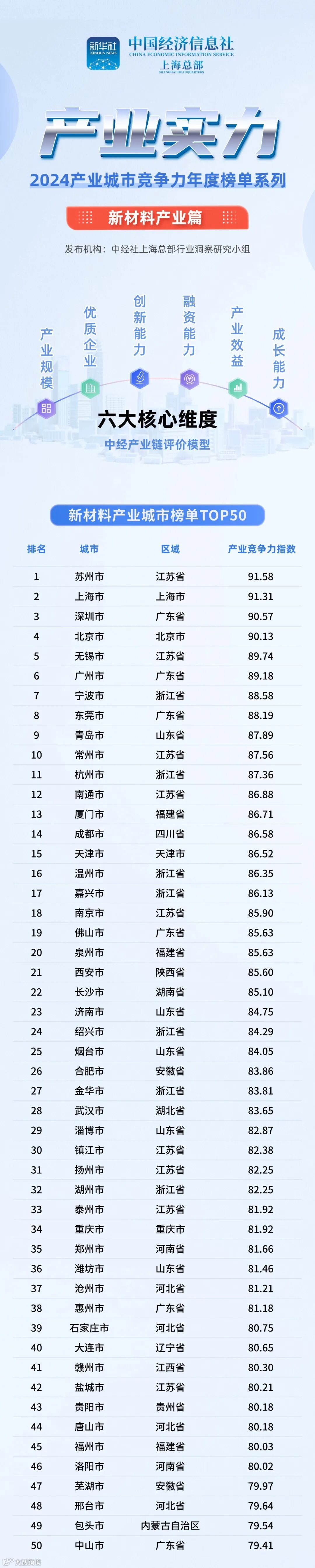 2 月 11 日,中国经济信息社上海总部行业洞察产业数据服务平台发布的 2024 年新材料产业城市竞争力年度 TOP50 排行榜,为各地新材料产业发展实力做了权威评估。此次评估依据产业规模、优质企业、创新能力、融资能力、产业效益和成长能力等六大核心维度,以及超 60 个指标,对产业链各环节进行综合考量。