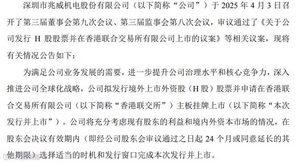 近日,兆威机电发布公告称,拟发行境外上市外资股(H股)股票并申请在香港联交所主板挂牌上市,旨在满足业务发展的需要,进一步提升治理水平和核心竞争力,深入推进全球化战略。