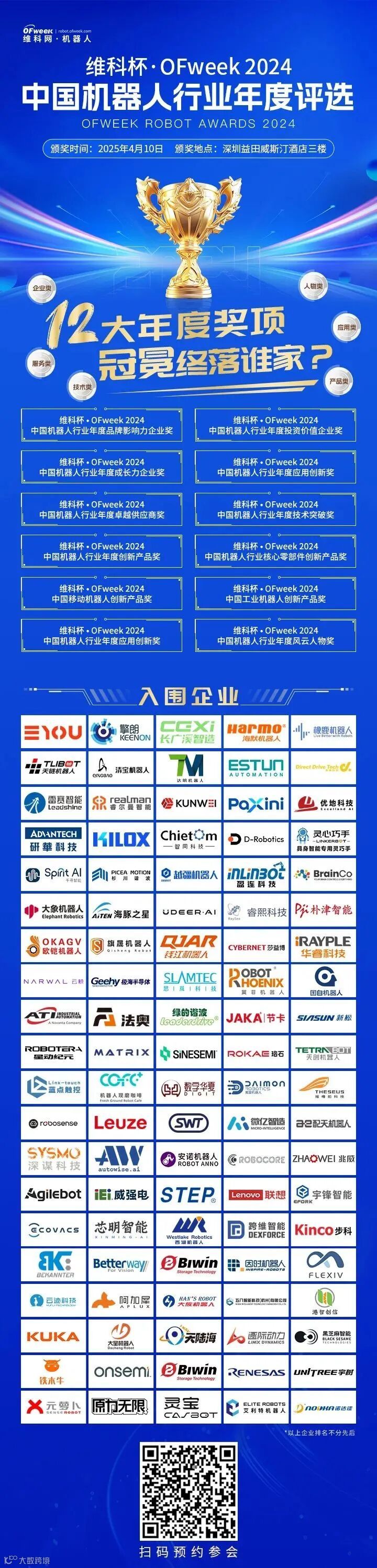 各大奖项最终获奖结果,将于2025年4月10日在深圳举办的“OFweek 2025(第十四届)中国机器人产业大会”上公布,不要忘记报名参与哦!