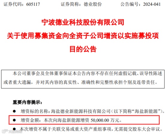 公告显示,海盐德业新能源科技有限公司是德业股份全资子公司,成立于2022年11月,注册资本为4亿元。