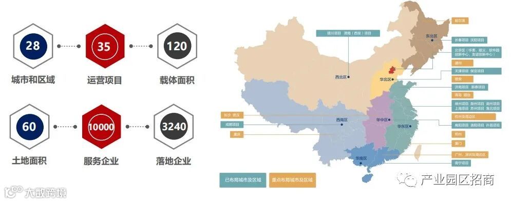 以全国28个城市和区域为节点,运营35个项目;运营载体面积120万平米;合作土地面积60平方公里;服务创新型企业超过10000家;落地企业近3240家。