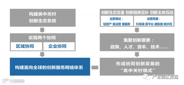 致力于在合作城市构建类中关村生态系统,建立以北京为核心、四个直辖市为支撑、面向全球的创新服务网络体系,实现合作城市与合作企业的协同发展 。