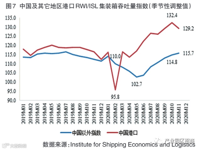 图7中,中国港口的集装箱吞吐量指数的变化趋势显示,2020年2月,中国的国际航运受到了新冠肺炎疫情爆发带来的十分严重的影响,集装箱吞吐量指数远远低于2019年的最低水平。在中国政府对于疫情的严格管控之下,中国航运实现了稳定恢复。进入2020年第二季度之后,中国港口的集装箱吞吐量指数显著增长,在2020年10月达到波峰。由于进入冬季后,疫情在全球出现反复,中国港口的集装箱吞吐量出现了一定程度的下滑。与中国港口的集装箱吞吐量指数的变动趋势略有不同的是,中国以外港口的集装箱吞吐量指数在2020年初开始出现下滑,在2020年5月触底反弹,在2020年10月恢复至疫情前水平。政府能否对于疫情实行良好的管控对于港口集装箱吞吐量有重要的影响,中国的疫情在2020年3月即得到了有效控制,经济秩序得到了恢复,因而港口集装箱吞吐量也得到了有效的恢复。反之,国际疫情的不断蔓延影响了其它主要经济体的经济与生产秩序,导致中国以外港口集装箱吞吐量直至2020年5月方开始实现恢复。